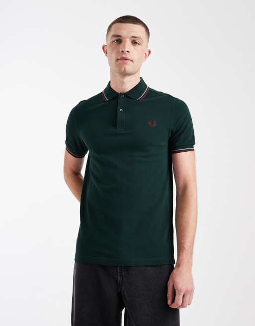 Polo verde oscuro con ribetes dobles y logo de Fred Perry