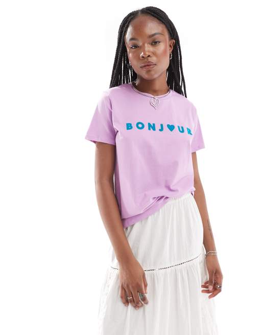 Camiseta lila con estampado "Bonjour" de punto liso de French Connection