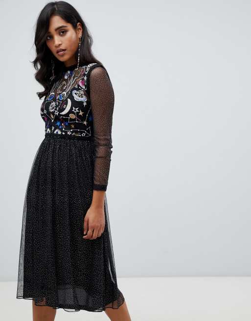 Vestido a media pierna de manga larga con estampado de estrellas en negro de Frock And Frill