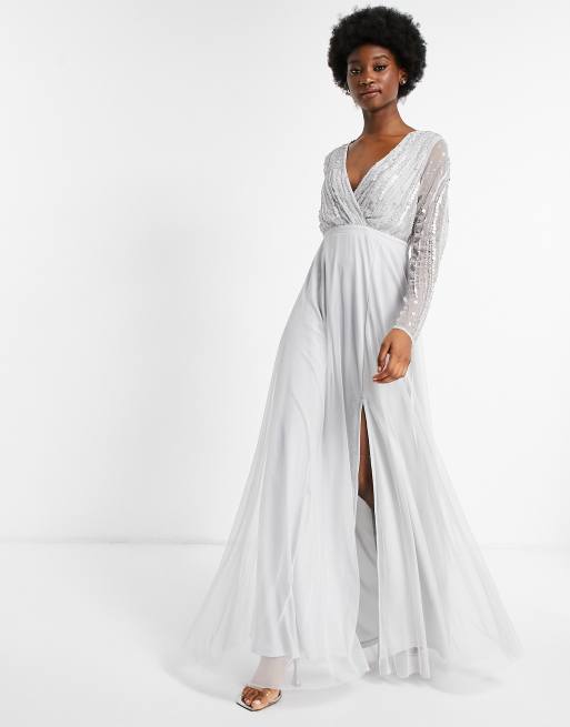 Vestido de graduación largo gris paloma con pecho cruzado y abalorios de Frock and Frill