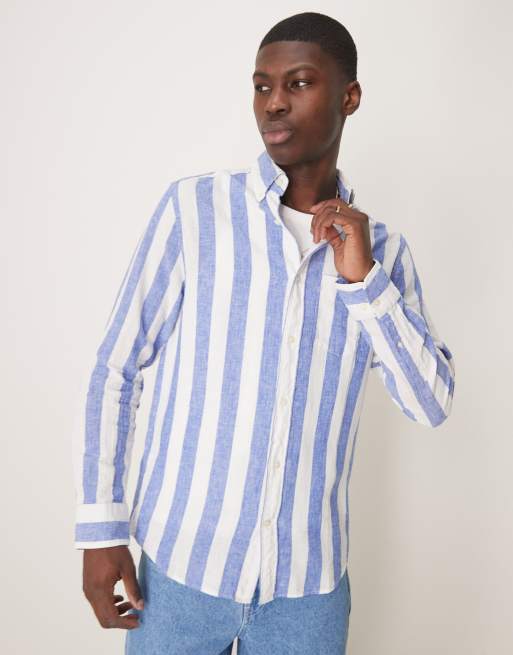 Camisa a rayas azul medio con logo de escudo de algodón y lino de GANT