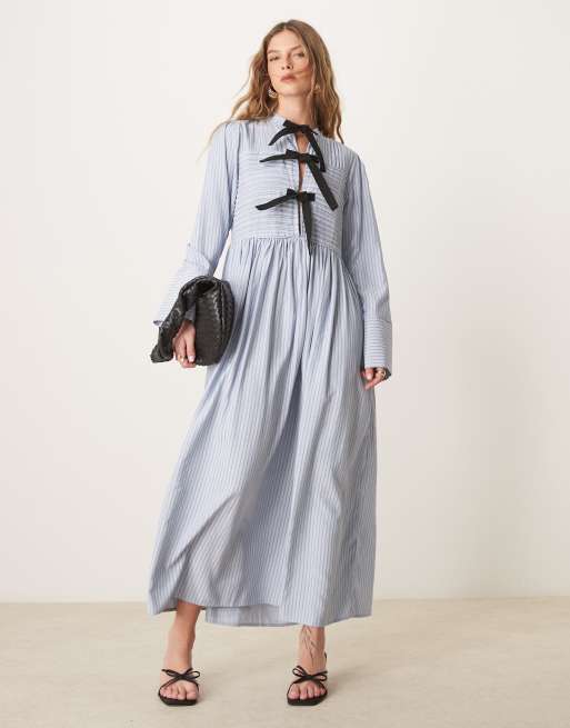 Vestido midi azul a rayas con detalle de lazada de Ghospell