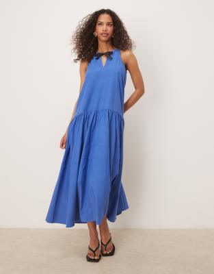 Vestido midi azul escalonado con lazo en contraste de Ghospell