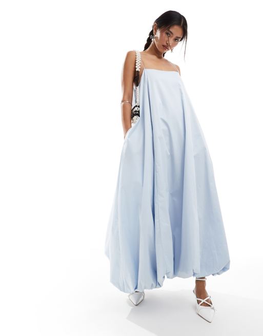 Vestido semilargo azul polvoriento con bajo abullonado de Ghospell