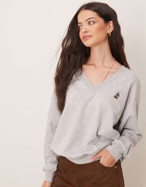 Jersey gris claro jaspeado de corte holgado y cuello de pico con estampado gráfico de osito de peluche de Gina Tricot