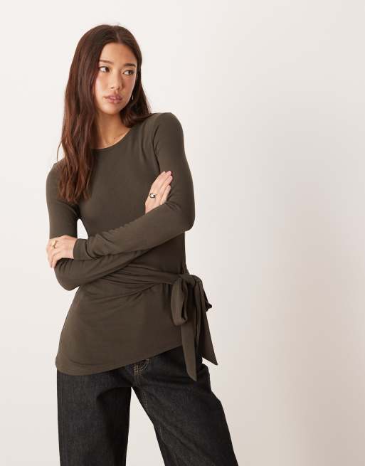 Top caqui oscuro asimétrico de manga larga con detalle de lazada de Gina Tricot