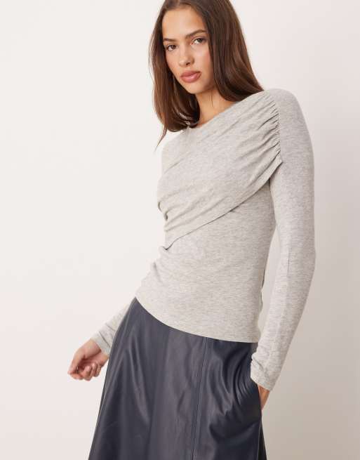 Top gris jaspeado fruncido y drapeado de manga larga y corte slim de Gina Tricot