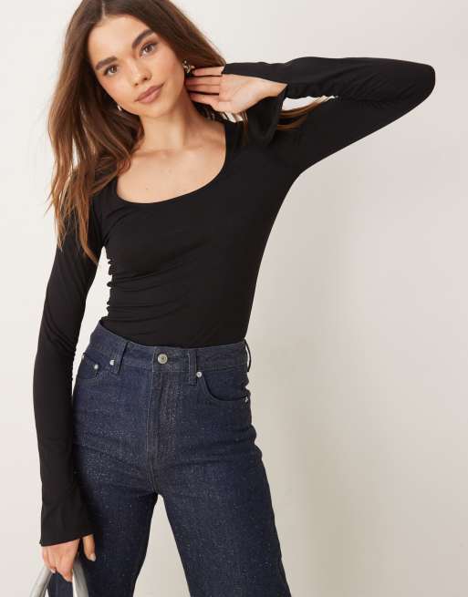 Top negro de manga larga con cuello ancho y puños abiertos de tejido suave de Gina Tricot