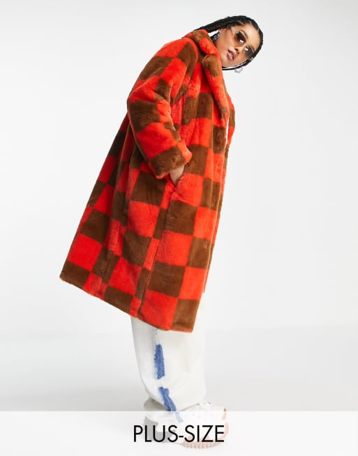 Abrigo largo color tostado y mandarina a cuadros dameros de piel sintética de Girlfriend Material Curve