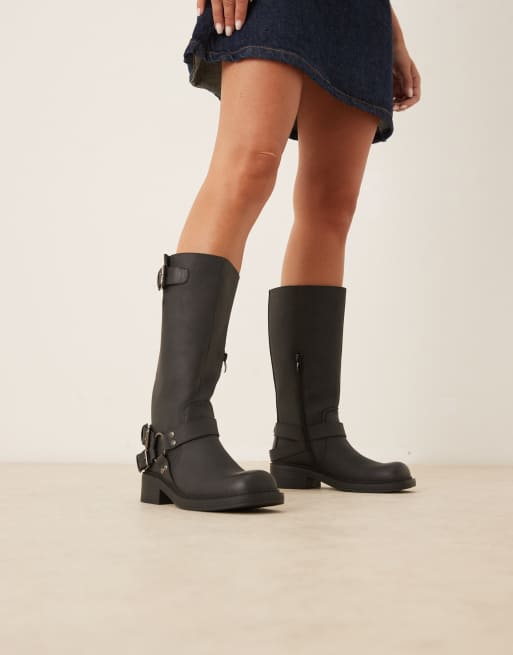 Botas biker por la rodilla negras con detalle de arnés de Glamorous Wide Fit
