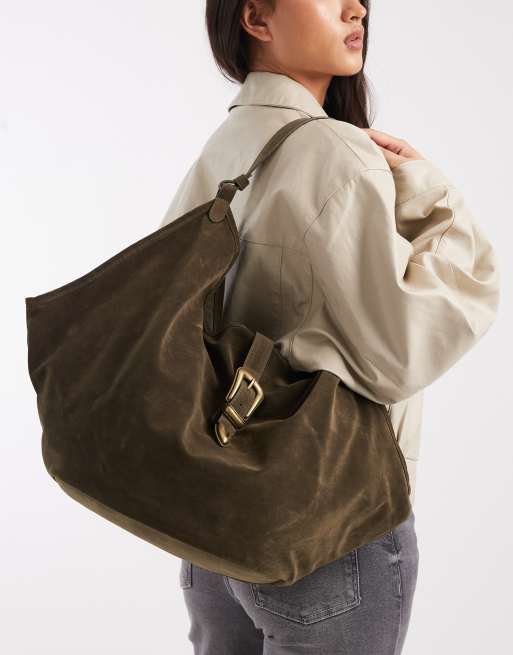 Bolso tote de hombro verde caqui flexible de antelina con detalle de hebilla metálica de Glamorous
