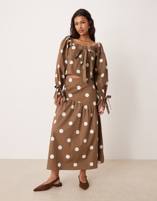 Falda semilarga marrón asimétrica de talle bajo con estampado de lunares de Glamorous (parte de un conjunto)