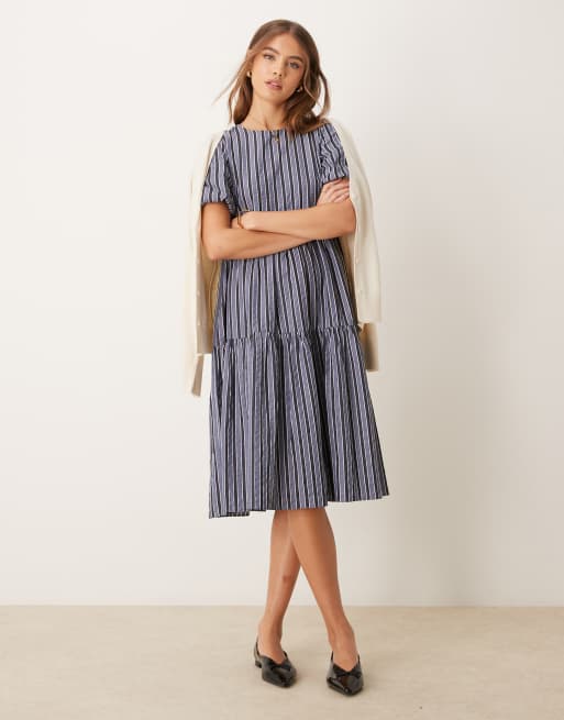 Vestido midi a rayas azules y grises escalonado con mangas abullonadas de Glamorous