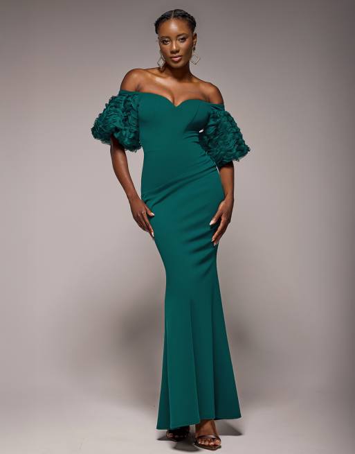 Vestido largo verde esmeralda con escote Bardot corazón y mangas abullonadas tridimensionales de Goddiva