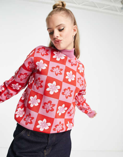 Jersey rojo con cuello alto y estampado de cuadros y flores de Heartbreak