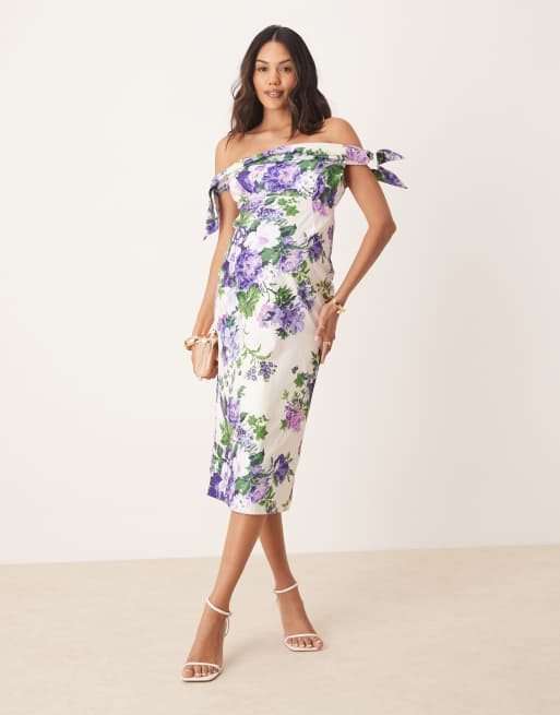 Vestido de tubo midi blanco y morado con escote Bardot y detalle en las mangas de Hope & Ivy Maternity