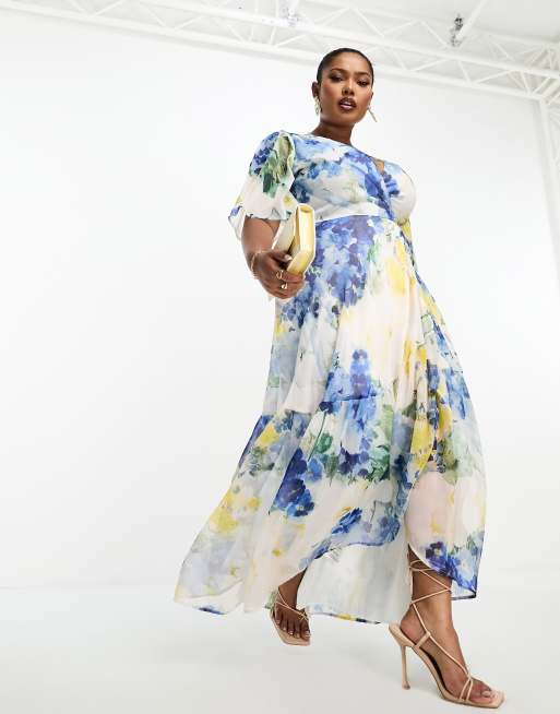 Vestido largo azul cruzado con estampado floral y volantes de Hope & Ivy Plus