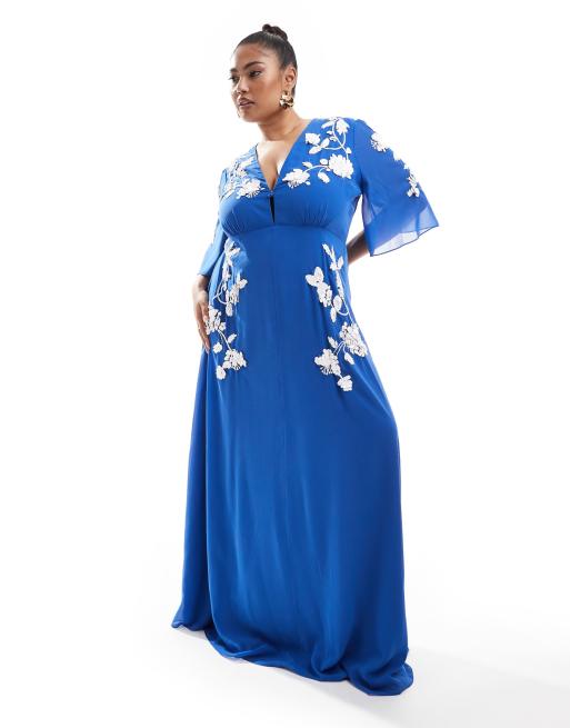 Vestido largo azul escotado con detalle adornado de flores de Hope & Ivy Plus