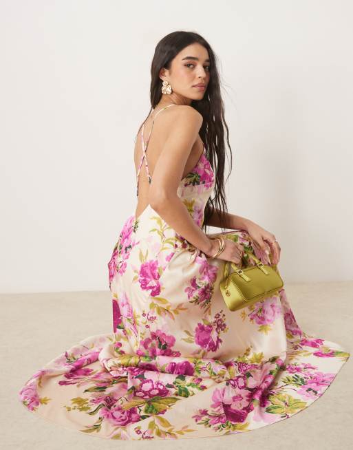 Vestido largo blanco de tirantes con estampado floral rosa y tiras cruzadas en la espalda de Hope & Ivy