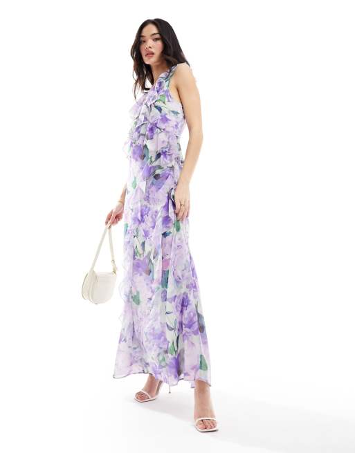 Vestido largo lila con estampado floral y volantes en la parte delantera de Hope & Ivy