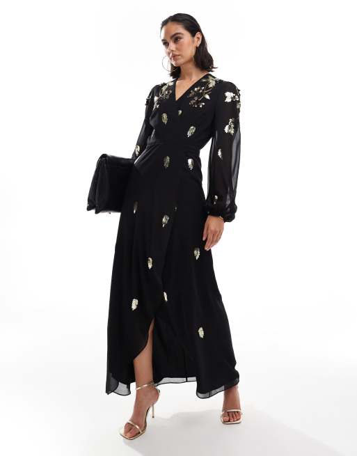 Vestido largo negro con parte delantera cruzada y adornos dorados de Hope & Ivy
