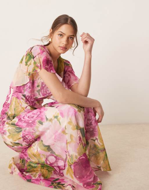 Vestido largo rosa estampado con cuello desbocado y mangas efecto cascada de Hope & Ivy