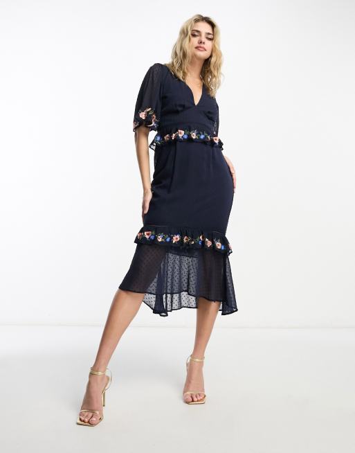 Vestido midi azul marino con mangas fluidas y bajo bordado de Hope & Ivy