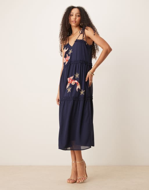 Vestido midi azul marino escalonado con diseño de carpas de abalorios y tiras anudadas de Hope & Ivy