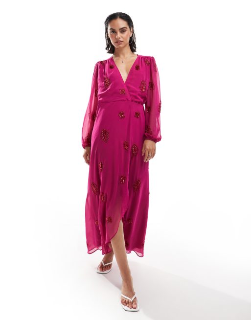 Vestido semilargo rosa fucsia cruzado con diseño adornado de Hope & Ivy