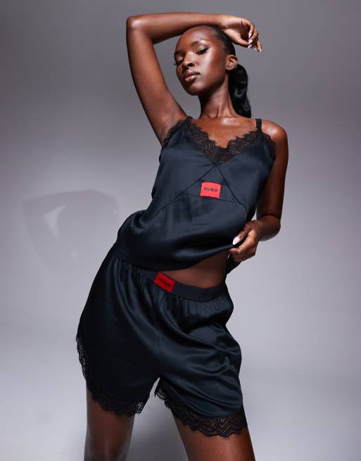 Pantalones cortos de pijama negros de satén con ribete de encaje de HUGO Bodywear (parte de un conjunto)