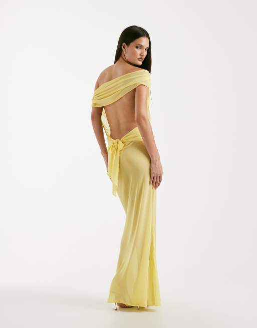 Vestido largo amarillo con hombro caído, espalda al aire y detalle de lazada de chifón transparente Kahlo de I.AM.GIA