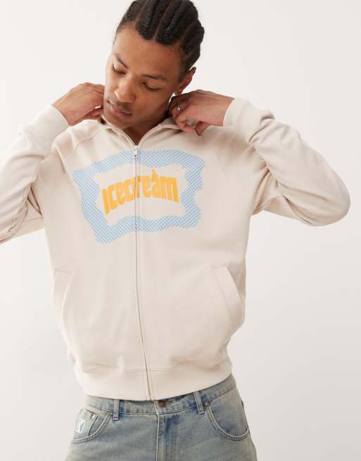 Sudadera blanco hueso con capucha, cremallera y logo estilo color block de ICECREAM