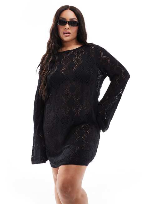 Vestido playero corto negro con mangas acampanadas de croché exclusivo de In The Style Plus