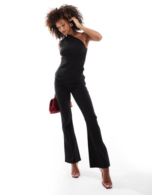 Conjunto negro de pantalones de campana y top de corte alargado con escote palabra de honor plegado de bengalina de In The Style