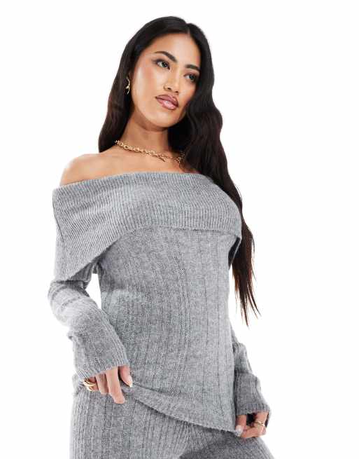 Jersey gris con escote Bardot plegado de punto de canalé de In The Style (parte de un conjunto)