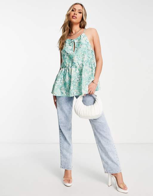Top verde salvia con estampado de florecitas, lazada en la parte delantera y bajo con sobrefalda de In The Style x Stacey Solomon