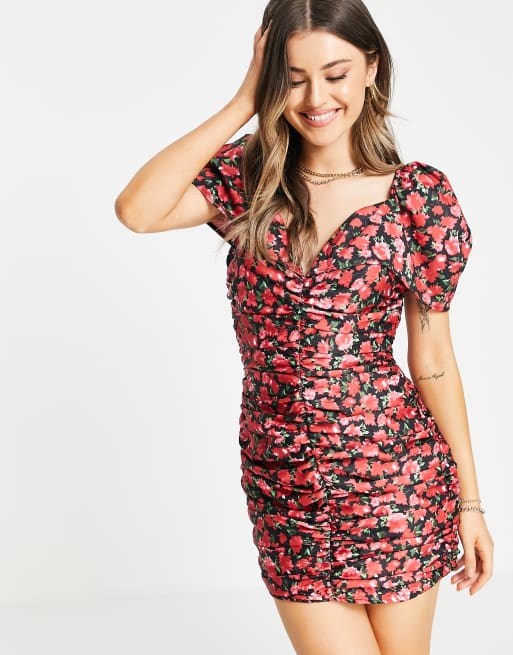 Vestido corto negro escotado con pliegues en la parte delantera y estampado floral de In The Style x Jac Jossa