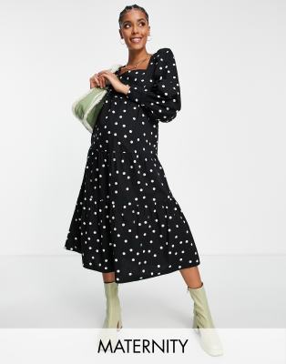 Vestido midi escalonado con estampado de lunares y escote cuadrado de popelina de algodón de Influence Maternity