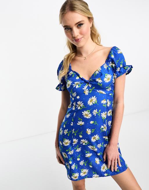 Vestido corto azul con estampado de margaritas y lazada delantera de Influence