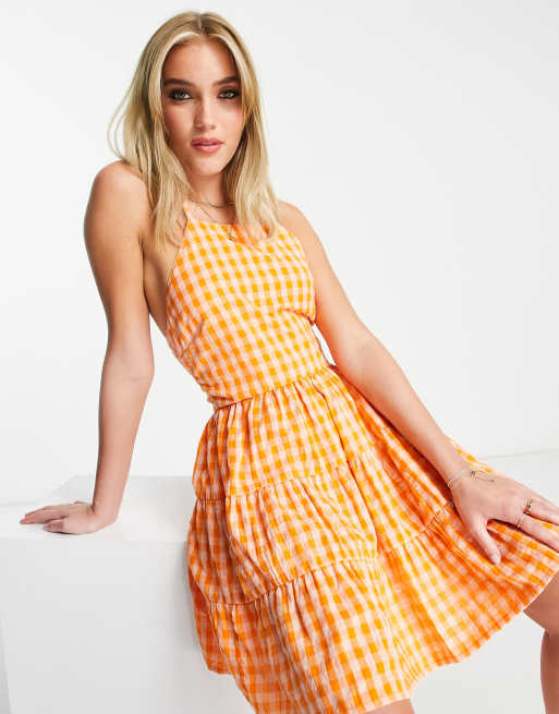 Vestido corto naranja de tirantes escalonado a cuadros vichy con lazo en la espalda de Influence