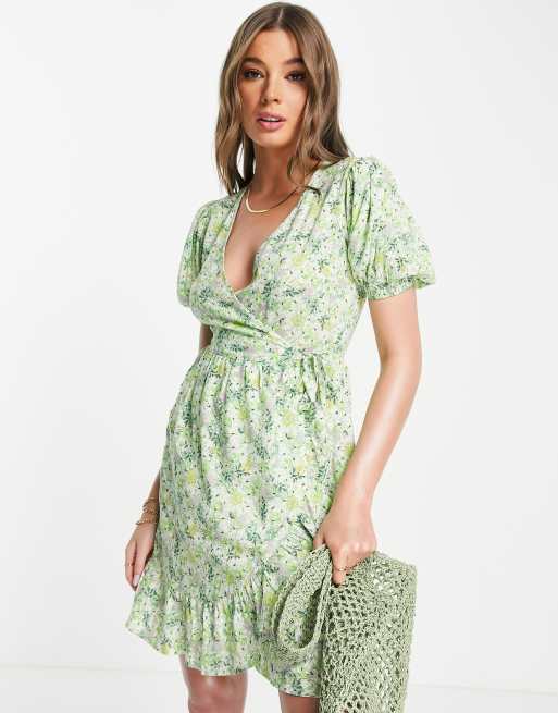 Vestido corto verde cruzado de manga corta con estampado de florecitas de Influence