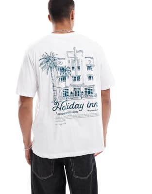 Camiseta blanca extragrande con estampado "Holiday Inn" en la espalda de Jack & Jones