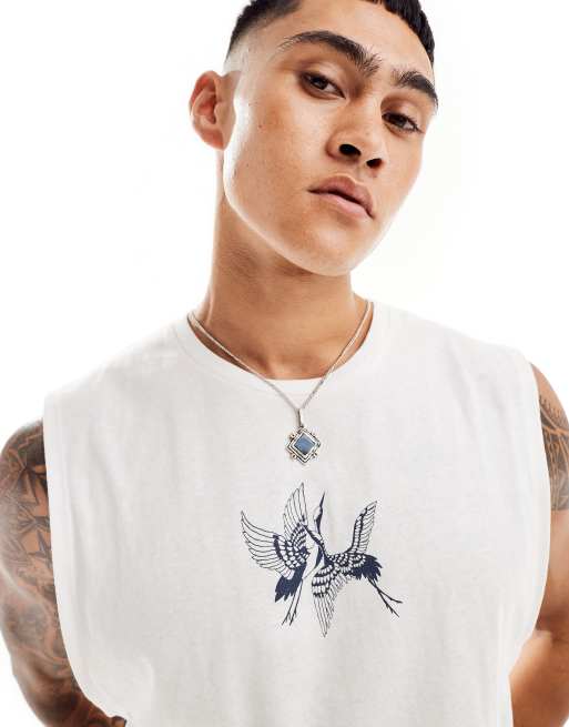 Camiseta blanca extragrande sin mangas con estampado de grulla en el pecho de Jack & Jones