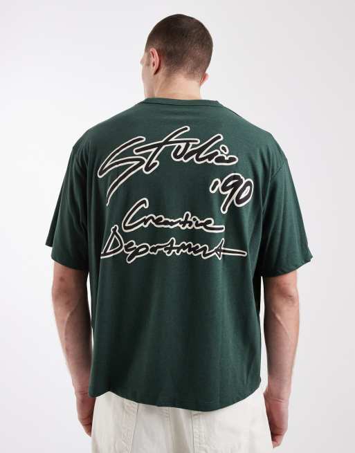 Camiseta corta verde de corte cuadrado con estampado "Studio" en la espalda de Jack & Jones
