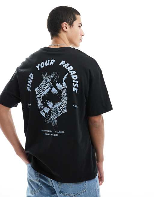 Camiseta negra extragrande con estampado de carpa koi en la espalda de Jack & Jones