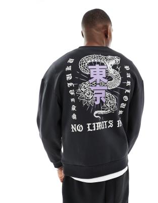 Sudadera negra extragrande con cuello redondo y estampado de serpiente en la espalda de Jack & Jones