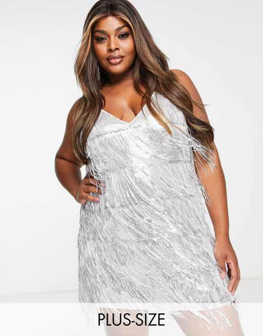 Vestido corto plateado de tirantes con flecos de lentejuelas de Jaded Rose Plus