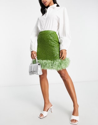 Conjunto verde lima de top corto de manga corta y minifalda con ribete de plumas sintéticas de Jaded Rose