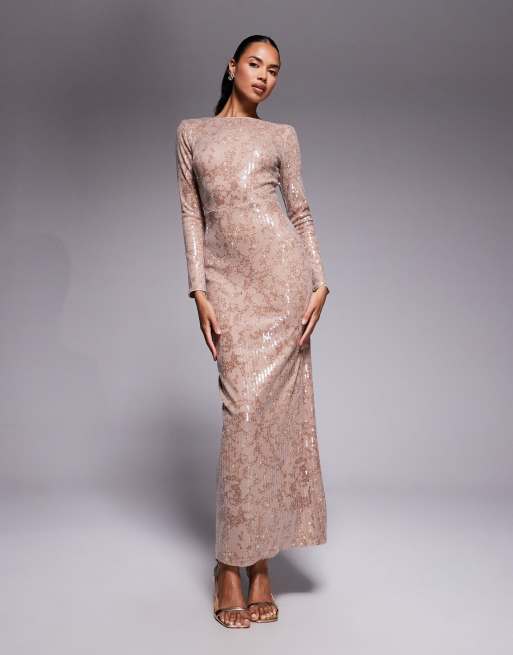 Vestido largo dorado pastel de manga larga de lentejuelas metalizadas de Jaded Rose