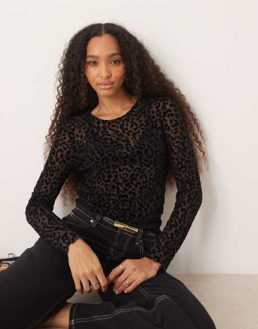 Top negro de manga larga con estampado de leopardo de malla de JDY